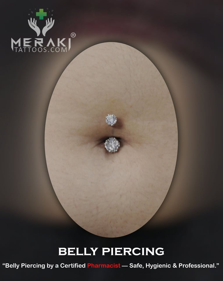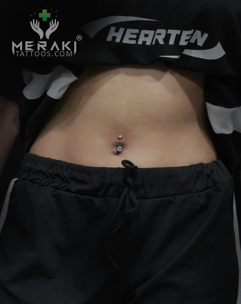 Looking for the most reliable and hygienic belly piercing in Ahmedabad? At Meraki Tattoos, we offer clean, professional and perfectly placed navel piercings performed by an experienced piercer who is also a certified pharmacist.