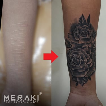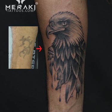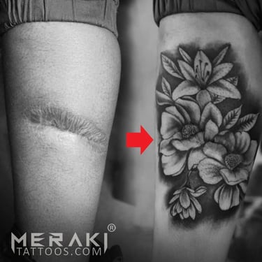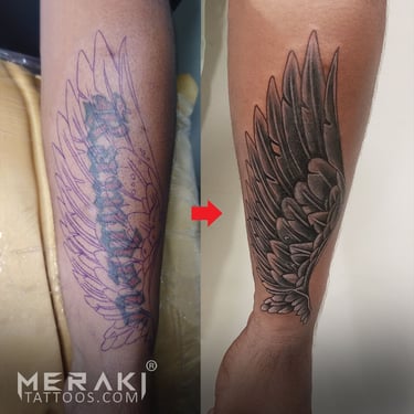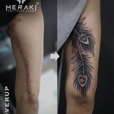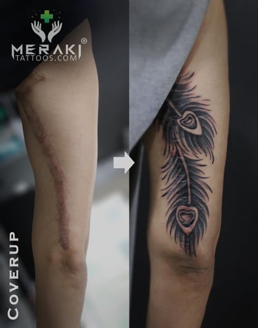 At Meraki Tattoos, Ahmedabad, we specialize in professional cover-up tattoos that completely transform your old, faded, or unwanted tattoo into a fresh, clean new design. Whether you want to fix a poorly done tattoo, hide a name, redesign an old pattern, or cover scars, our experienced artist ensures flawless coverage with premium-quality ink and safe techniques.
