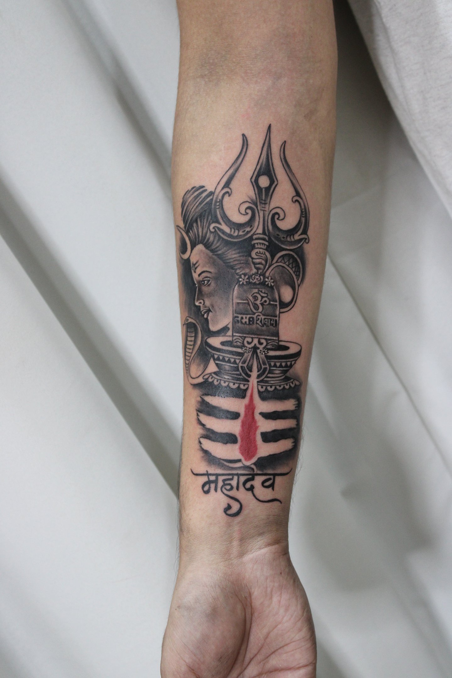 This powerful Lord Shiva tattoo beautifully merges devotion with artistry. The design features an intricately detailed face of Lord Shiva alongside a prominent Shivling, topped with a sacred Trishul and Damru. A snake wraps gracefully around the structure, symbolizing divine energy and control over fear. The bold Tripundra lines and striking red tilak evoke spiritual strength, while the Sanskrit word "महादेव" adds a deep sense of reverence. The shading and contrast work highlight the depth and emotion of the piece, making it a timeless tribute to Mahadev’s eternal presence.